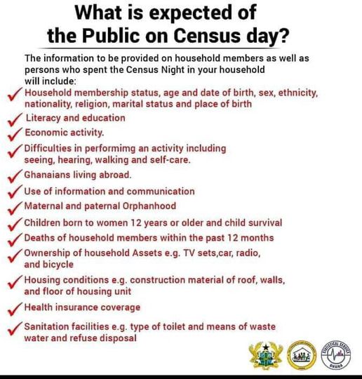 The District Census officer for Central Tongu Mr Courage Godzo, says from the 13th to the 30th June , members of the District should expect an enumerator visit their homes to collect information on all persons who slept in their houses on the night of June. "Ensure that an adult member is available to answer questions on behalf of other household members.